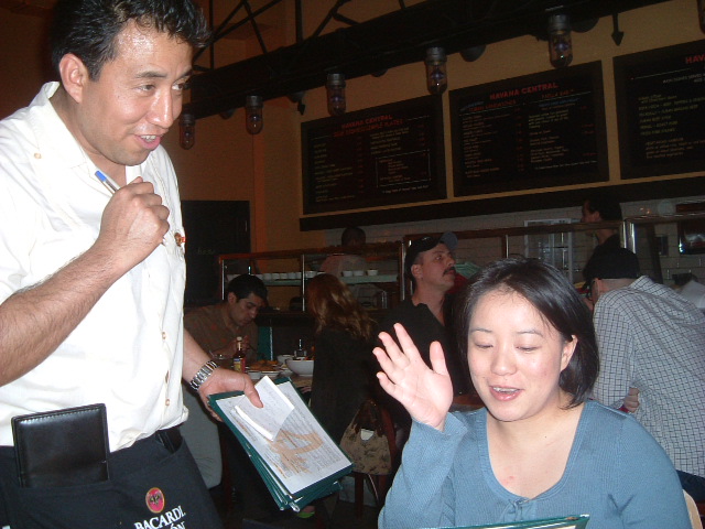 14th street yummy Cuban Food:Jody ordering around the waiter